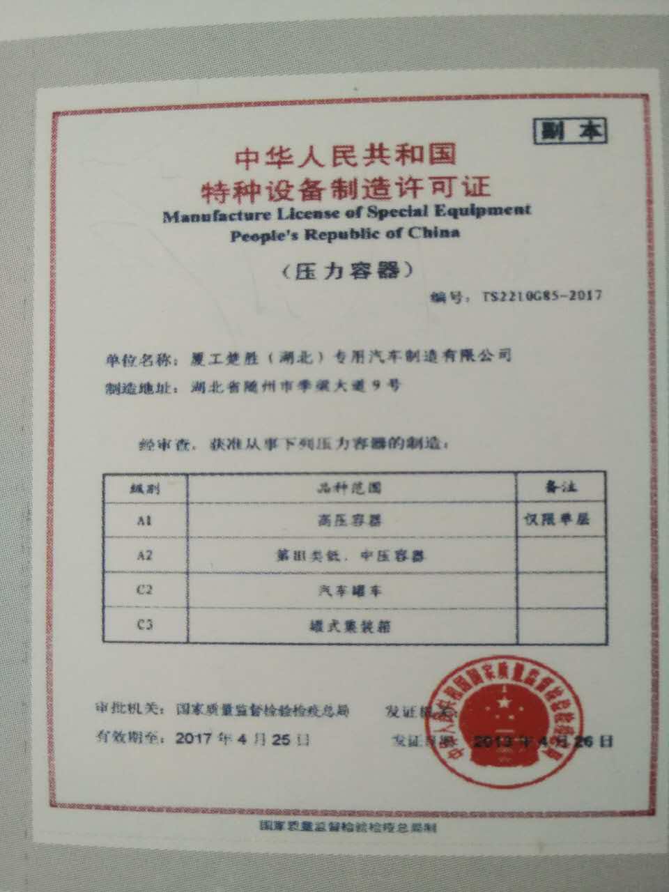 比這個更高一級的是 《中華人民共和國特種設備制作許可證(壓力容器)》