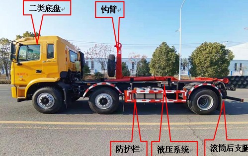 CLW5240ZXX6HH車(chē)廂可卸式垃圾車(chē)是在二類(lèi)汽車(chē)底盤(pán)的基礎(chǔ)上,加上鉤臂、液壓系統(tǒng)、防護(hù)欄、連接附件等裝置組成,具體如下: